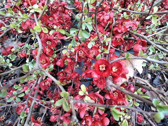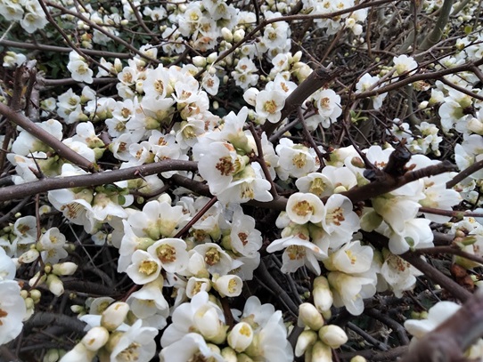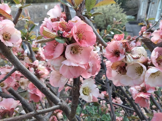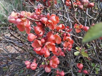 aspect of the garden and in full sun to light shade. These shrubs flower predominantly in the late winter early spring period. The flowers depending on variety can be red, white, orange, pink and lemony colours. Also depending on variety, the flowers and either single or semi double. These shrubs are a good early source of nectar for early pollinators on sunny day. In the autumn as the leaves fall on some varieties small the large apple shaped yellow fruits appear. From these fruits that are highly fragrant you can make a type of Japanese quince jelly. I have made it as it was described and lemony. I found no such thing. It did make a nice well-set jelly but, the taste was not good. These shrubs can be trained on a wall or clipped as bushes in the garden.