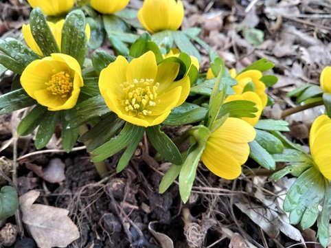 The winter aconite. This amazing golden yellow flowered plants with a fun green ruff under the petals. When the sun shines the flowers open and are most cheery in the winter days. Great for naturalizing with snowdrops.