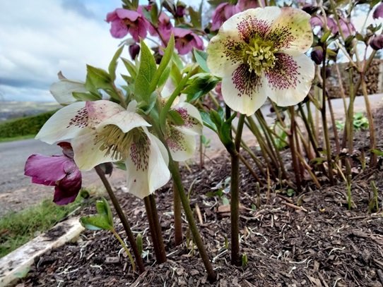 Helleborus orientalis, known as the Lenten rose but it does tend to flower much earlier than Easter. I have a variety in my own garden that’s flowering at Christmas every year. These lovely herbaceous plants with red through to pink and white and some yellow and orange flowers. Some are single and some are double flowering. Once the old leaves are cut away the flowers on the stems are clearly seen. They make a great addition planted with snowdrops.