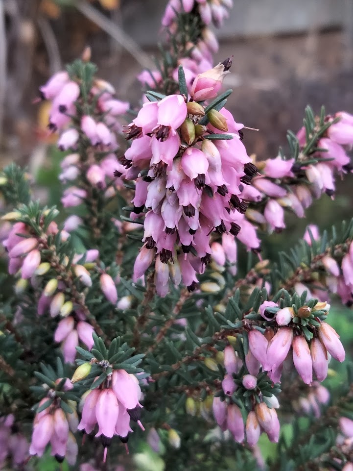 The flowers on heathers are small and bell shaped but there are just loads of them on the stems that carry them. Interesting to note that the anthers poke out the bottom of the bells and are either tan/brown or black with a spot of yellow for the pollen. The flowers themselves are white, pink and dark pink/red. The flowers occur on the current season’s growth. (That growth made this year)