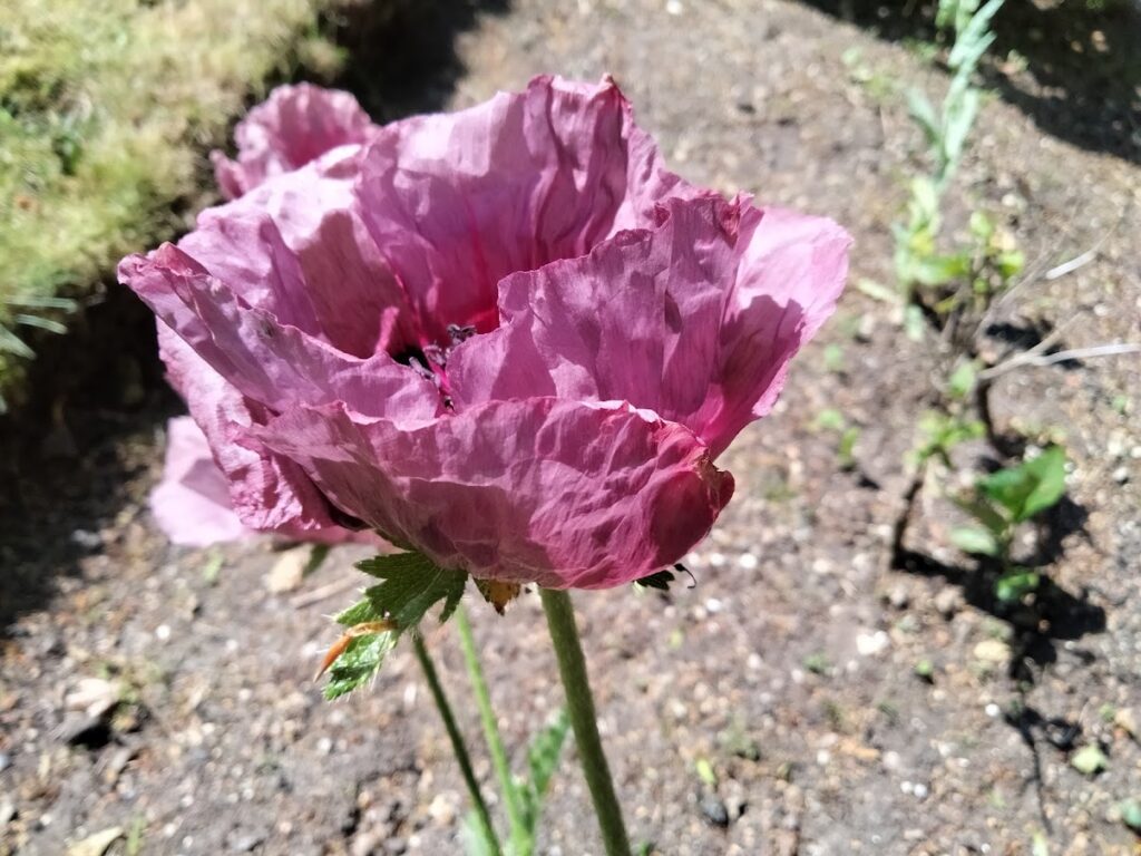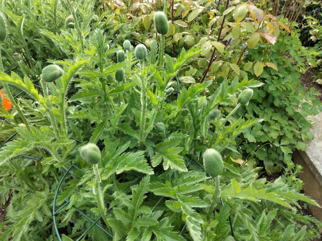 These plants emerge in mid spring with large green divided leaves which are also bristly. (note that some people are allergic to the bristles on poppies as well as the sap). The plants can get large with maturity and can grow with flowers 3-5 feet high.