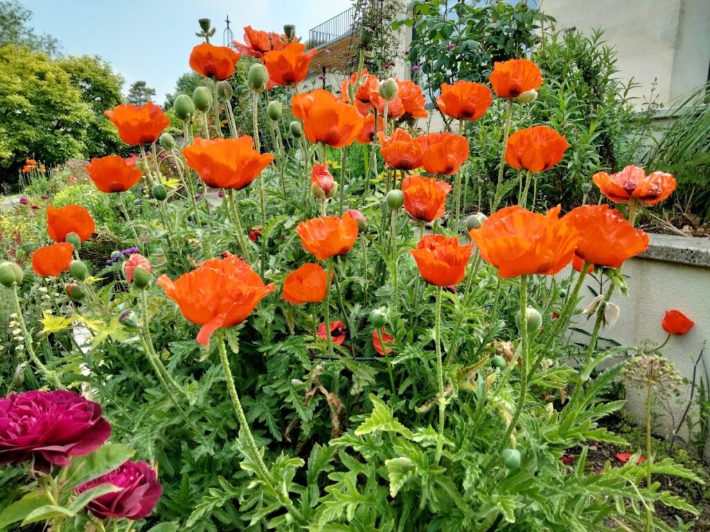 Of the most dramatic early summer plants are the oriental poppies. These plants emerge from to grown in mid spring with their lovely finely divided leaves. Somewhat later the large buds on strong stems emerge from the froth of leaves. Then once the buds open, they reveal large papery petaled flowers.