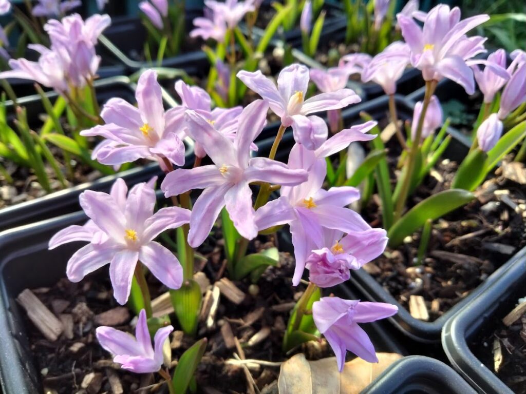 Chinodoxa, lovely small bulb flowering in March. Often blue like Chionodoxa sarnensis but can be white and lovely clear pink shades Chinodoxa rose queen being particularly nice. These are quite lovely open star shaped flowers.
