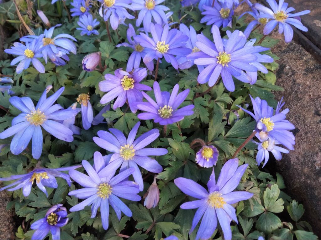 Anemone, these usually from small corms (bulbs) Anemone blanda being most common in shades of pale to rich blue but some are white like Anemone white splendor and occationally pink. However, some of the rhizomatic (roots) types like Anemone apinina can be and are quite rewarding plants that multiply quickly and both are great for a area under trees.