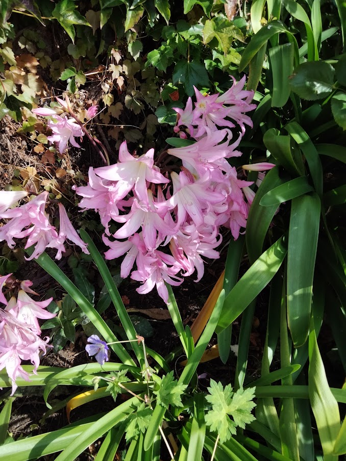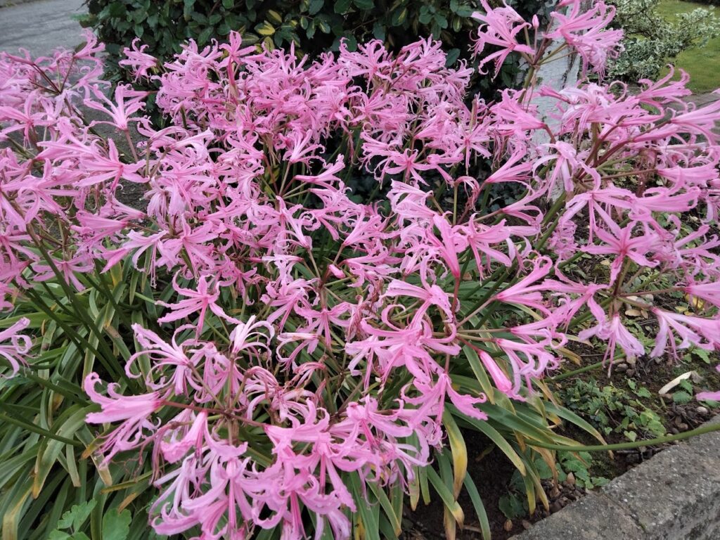 Nerine Bowdenii beautiful clusters of mostly clear pink wavy/ crinkly trumpet petals at around a foot high. These this time of year are bought as growing and flowering bulbs.
