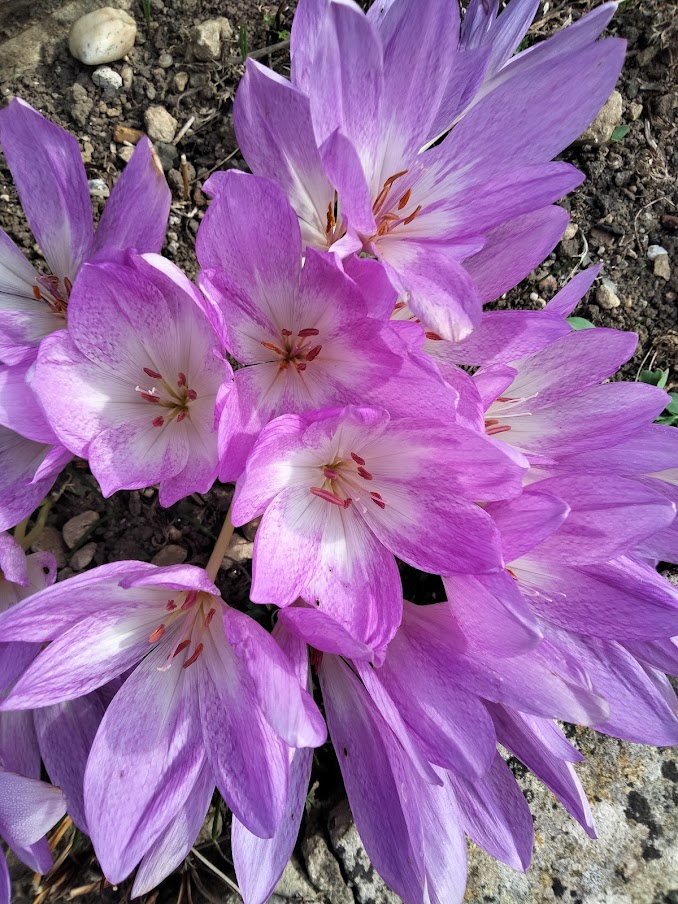 These appear in the garden as very large goblet shaped crocus lookalike flowers in September and October. The bulbs can be quite expensive in some varieties but they certainly make up for that when they flower. These flowers are predominantly pinkish to lilac/purplish. A few are white. The flowers are also mostly single goblets and a few varieties are doubles.