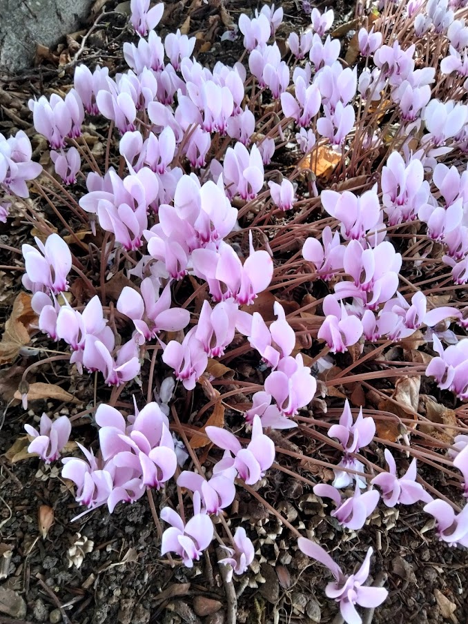 These absolutely charming woodland bulb with ivy reminiscent shaped leaves in shades of green and silver. Some varieties have completely pewter (silver) leaves. They flower in shades of pink through to white and the flowers grow to 4-5’’. These bulbs can often be flowering from early August right up in to November. These bulbs (corms) can mature to a foot across and have hundreds of flowers. They are good for naturalizing dappled shady areas and will also live in sun as well. Plant these either on the surface, where the soil comes up halfway on the bulb or plant just below the surface of the soil and the plant will find its own level.